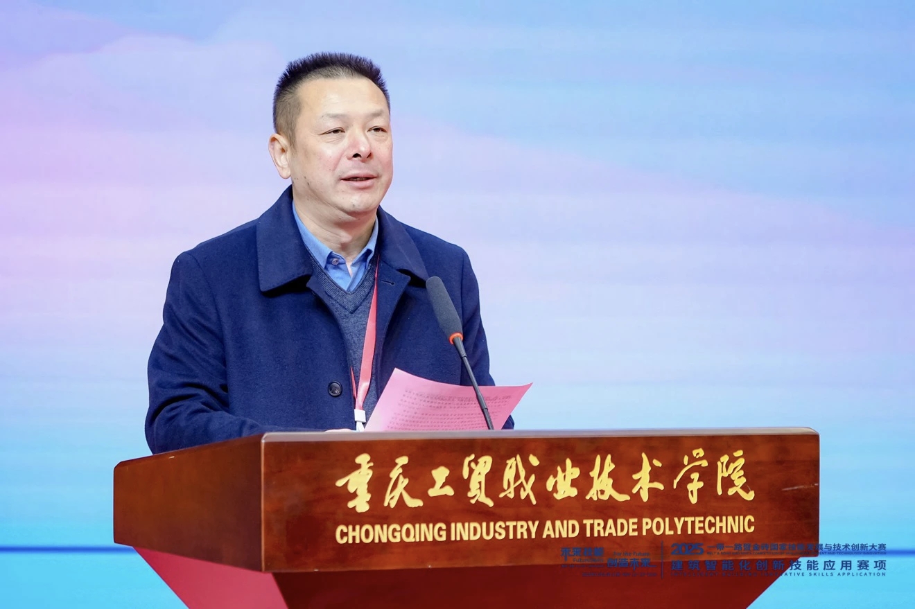 大赛开幕式上,中国建设教育协会常务理事赵研、重庆工贸职业技术学院党委书记唐玉林、广联达科技股份有限公司集团副总裁钱锋等领导嘉宾出席,金砖国家技能发展与技术创新大赛组委会执委会主席刘振英以视频方式出席,共同见证这一建筑智能化领域的赛事启幕。